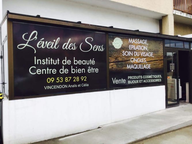 La carte visite de l'institut de beauté l'Eveil des Sens en IsèreLes tables de massage de l'institut de beauté l'Eveil des Sens La cabine de soins de l'institut de beauté l'Eveil des sens à Saint-Clair-du-RhôneLes produits mis en vente dans l'espace boutiqueLe coin boutique avec différentes propositions d'idées cadeau